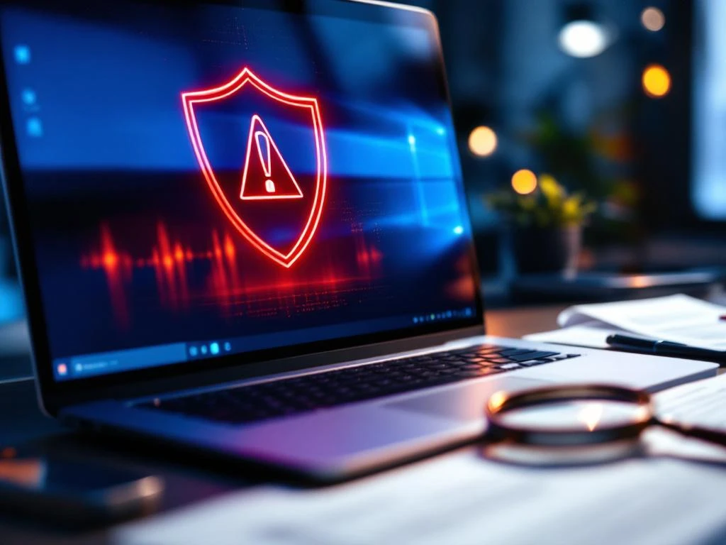 Laptop met rode waarschuwing op Microsoft interface, omringd door auditdocumenten en licentieovereenkomsten op bureau